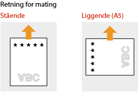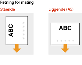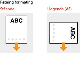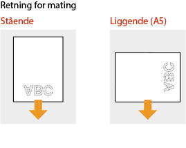 Når du kopierer, pass også på retningen til originaldokumentet.Legg originalen i materen med siden som skal kopieres vendende opp, eller plasser originalen på glassplaten med siden som skal kopieres vendende ned, som vist i de følgende illustrasjonene.