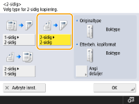 ![]() | Hvis du vil kopiere originaler i fristørrelse eller originaler med høy gjennomsiktighet Original, eller hvis du vil kopiere med papir satt i flerbruksskuffen, må du velge papir manuelt. |
