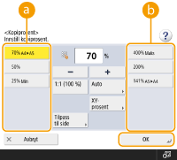![]() | Du kan forstørre eller forminske ved å spesifisere kopieringsforholdet (%). Du kan spesifisere de vertikale og horisontale forholdene individuelt. Forstørre eller forminske kopier ved å angi kopieringsforholdet | |