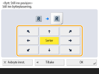Innst. retningsforskyvn. Avhengig av retningen på originalen og stedet den plasseres, vil retningen bildet forskyves til avvike. Når originalen legges på glassplaten Øverst på sidekant: Bilde vil forskyves til høyre og/eller bunnen. Øverst på bortre kant: Bilde vil forskyves til venstre og/eller bunnen. Når originalen plasseres i materen Øverst på sidekant: Bilde vil forskyves til venstre eller høyre og/eller bunnen. Øverst på bortre kant: Bilde vil forskyves til toppen eller bunnen, og/eller til høyre. Ved bruk av funksjonen Bruk posisjon: Bildet vil forskyves, men dets posisjon vil justeres slik at hele bildet kopieres uten at det beskjæres. Hvis Etter talltaster-funksjonen brukes: Det kopierte bildet kan være avkuttet. |