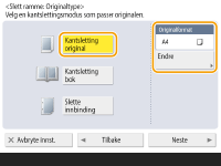 <Kantsletting>.1 | Trykk på <Kantsletting original> og kontroller <Originalformat>. ![]() Hvis størrelsen som vises i <Originalformat> er en annen enn størrelsen på originalen, trykker du på <Endre> for å velge størrelsen. Du kan innstille sletting av originalkanter kun for originalstørrelsene som vises på berøringspanelskjermen. |