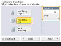 1 | Trykk på <Kantsletting bok> og kontroller <Originalformat>. ![]() Hvis størrelsen som vises i <Originalformat> er en annen enn størrelsen på boken, trykker du på <Endre> for å velge størrelsen. Du kan angi sletting av bokkanter kun for originalstørrelsene som vises på berøringspanelskjermen. |