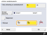 Du kan ikke utføre direkte sending hvis du angir <Arkiver sendedokument> til <På>. Denne innstillingen bytter automatisk til <Av> i følgende tilfeller. Spesifiser destinasjonen igjen eller returner innstillingen til <På> som nødvendig. Når sikkerhetskopidestinasjonen er slettet fra adresseboken Når en adressebok er importert fra et eksternt brukergrensesnitt Importere/eksportere innstillingsdata Når en adressebok mottas fra administrasjonsprogramvaren for adressebok <Importer/eksporter fra programvare for adr.bokbeh.> |