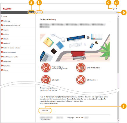 Klikk for å vise informasjon om hvordan du viser Bruksanvisning, hvordan du søker og annen informasjon.