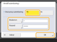 For å bruke godkjenningsfunksjonen for proxy-serveren, trykker du på denne og konfigurerer godkjenningsinformasjonen. På skjermbildet som vises, trykker du på <På>, skriver inn brukernavnet og passordet som skal brukes til proxy-godkjenning, og trykker på <OK>.