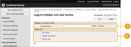 Klikk på [Utstyrstyring] [Innstillinger for e-postvarsling]  [Legg til mottaker som skal varsles].