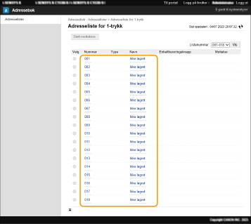 Klikk på adresselisten som mottakeren skal registreres i ([Personlig adr.liste], adresselister for brukergrupper, [Adresseliste 01] til [Adresseliste 10], eller [Adresseliste for administratorer]).