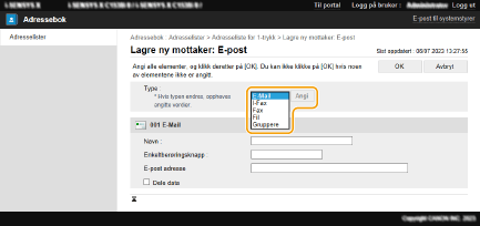 Du kan også stille inn at navnet på adresseboken til brukergruppen skal endres når et brukergruppenavn endres. Logg inn på Fjernkontroll som en bruker med administratorrettigheter, trykk på [Innstillinger/lagring] [Innstill mottaker] [Innstillinger for personlig adresseliste/ adresseliste for brukergruppe], og huk av i avmerkingsboksen [Bruk endret brukergruppenavn i navn for adresseliste for brukergruppe]. [Bruk endret brukergruppenavn i navn for adresseliste for brukergruppe] er kun tilgjengelig når personlig godkjenningsstyring er aktivert.