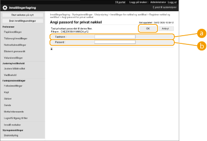 2 | Skriv inn nøkkelens navn og passord, og klikk på [OK]. [Tastnavn]Bruk alfanumeriske tegn til å skrive inn navnet på nøkkelen som ble registrert til maskinen. [Passord]Bruk alfanumeriske tegn til å skrive inn passordet for den private nøkkelen som er angitt for filen som skal registreres. |