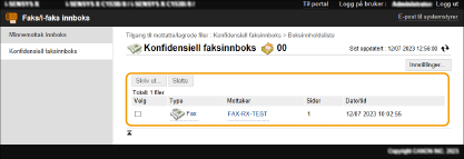 Slik endrer du innstillingene for en konfidensiell faksinnboksDu kan endre navnet og PIN-koden for den valgte konfidensielle faksinnboksen ved å klikke på [Innstillinger] på skjermen vist i trinn 4. |