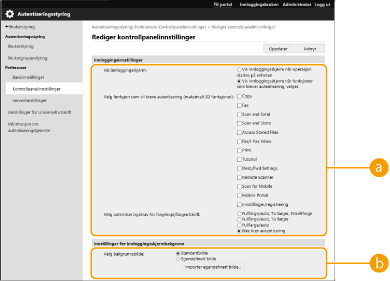 Angi brukerinnloggingsmetodene (Påloggingsmetode) og godkjenningsenhetene (Godkjenningsenhet). Merk at godkjenningsenhetene må angis før du konfigurerer innstillingene nedenfor.