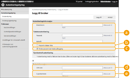 [Endre passord ved neste pålogging]Velg denne avmerkingsboksen for å tvinge registrerte brukere til å endre passordet sitt første gangen de logger på. Så snart en bruker har endret passordet sitt, fjernes avmerkingsboksen automatisk.