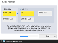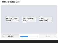 Angi metoden for tilkobling av maskinen til et nettverk. ![]() ![]() Du kan velge metode for å koble maskinen til datamaskiner osv. Velg tilkoblingsmetoden du vil bruke, og trykk på <Neste>. Hvis du valgte <Kablet LAN>, fortsetter du til trinn 7. Se Velge metode for nettverkstilkobling for detaljer om tilkoblingsmetoder for nettverk. ![]() Hvis du valgte <Trådløst LAN>, angir du trådløst LAN-innstillingene. ![]() Se Koble til et trådløst LAN hvis du vil vite mer om trådløst LAN-tilkoblinger. | |