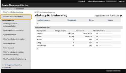 Du kan kontrollera antalet installerade program och utrymmet som används på lagringsenheten. Hantera MEAP-program