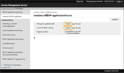 Innan du installerar ett MEAP-program måste du skaffa en "licensfil" via en dator. När du har hämtat licensfilen kan du öppna SMS via fjärrgränssnittet och installera MEAP-programmet.