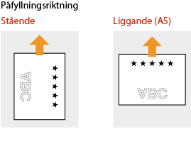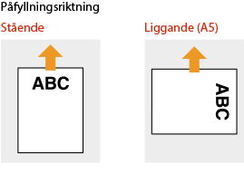 När du kopierar måste du också tänka på originaldokumentets riktning.Placera originalet i dokumentmataren med kopieringssidan uppåt eller placera originalet på originalglaset med kopieringssidan nedåt enligt nedan.