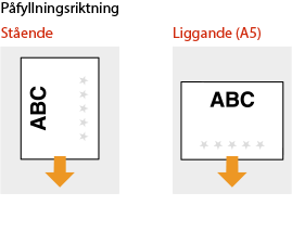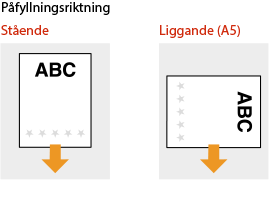 I det här avsnittet beskrivs hur du fyller på förtryckt papper i rätt riktning. För en beskrivning av hur du fyller på papper i papperslådan eller i universalfacket, se Grundläggande metod för papperspåfyllning. I det här avsnittet beskrivs hur du fyller på förtryckt papper vid enkelsidig kopiering/utskrift. När du gör dubbelsidig kopiering/utskrift på förtryckt papper fyller du på papper genom att placera papperet i motsatt riktning efter indikationerna i det här avsnittet. Om du vill se till att sidorna skrivs ut på rätt sida av förtryckt papper oavsett om det gäller ensidig eller tvåsidig utskrift kan du använda följande inställningsmetoder. Genom att ange papperstyp varje gång du skriver ut: fyll på den papperstyp som registrerats med "Förtryckt papper" inställt på <På> i <Inställningar för hantering av papperstyp>, ange denna papperstyp och skriv sedan ut. Genom att ange papperskälla varje gång du skriver ut: fyll på papper i papperskällan för vilken <Växla pappersmatningsmetod> är inställt på <Prioriterad sida>, ange denna papperskälla och skriv sedan ut. Rätt sätt att fylla på förtryckt papper när "Förtryckt papper" är inställt på <På> i <Inställningar för hantering av papperstyp> eller när <Växla pappersmatningsmetod> är inställt på <Prioriterad sida> Papperslåda: logotypsidan vänd uppåt Annan papperskälla än papperslåda: logotypsidan vänd nedåt |