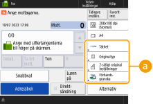 I <Favoritinställningar> kan du kan registrera ofta använda funktioner för kopiering, samt ofta angivna mottagare och inställningar för scanning. Mer information finns i Registrera en kombination av vanliga utskriftsinställningar.