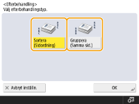 Beroende på papperstyp, kanske du inte kan använda efterbehandlingsfunktionerna. Maskinvaruspecifikationer När du placerar originalet på originalglaset.Om du trycker på <Alternativ> <Bygg jobb> på skärmbilden med grundläggande kopieringsfunktioner kan du använda Sortera/Gruppera även om originalet är placerat på originalglaset.Infoga ett skiljeark mellan varje sida under en grupputmatningOm du väljer <Gruppera (samma sidor)> kan du infoga ett skiljeark mellan varje grupp. För mer information, se <Skiljeark mellan grupper>. <Skiljeark mellan grupper> När du gör inställningar i <Åtkomst lagrade filer>Du kan endast använda efterbehandlingsfunktioner när du skriver ut PDF- eller XPS-filer. |