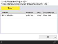 Du kan kontrollera hur mycket förbrukningsartiklar som finns kvar från fjärrgränssnittet. Kontrollera maskinens status |