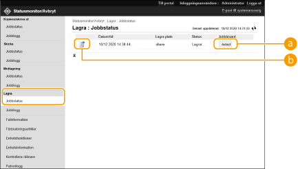 Starta Remote UI (Fjärrgränssnittet) [Statusmonitor/Avbryt]  [Jobbstatus] under [Lagra]