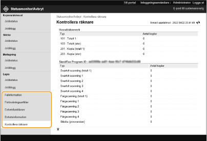 Du kan kontrollera olika slags information om maskinen, som t.ex. felinformation, mängden återstående papper och toner, information om monterade tillval och det totala antalet sidor som hittills skrivits ut.