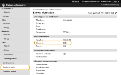 ![]() | Det kommer regelbundet nya versioner av den nya fasta programvaran, för att lägga till nya funktioner eller lösa problem med befintliga funktioner. Om ny programvara är tillgänglig, följer du anvisningarna nedan för att uppdatera den på maskinen. Administratörsbehörighet krävs för att uppdatera den fasta programvaran. |
