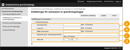 Efter automatisk export av granskningsloggar, raderas de insamlade granskningsloggarna automatiskt. Granskningsloggar kan inte tas bort manuellt. Alla loggar genereras när automatisk export och borttagning av granskningsloggar har utförts. Om andra logginsamlingar inte utförs vid nästa automatiska exporttillfälle, exporteras inte granskningsloggen automatiskt. Du kan också manuellt exportera granskningsloggar från Remote UI (Fjärranvändargränssnittet). Exportera loggar som en fil Om den automatiska exporten misslyckas, kommer maskinen att försöka igen flera gånger. Ett felmeddelande visas på kontrollpanelen på maskinen om automatisk export misslyckas ännu en gång. Ange en SMB-server för Windows Server 2012 eller senare, eller Windows 10 eller senare. Om maskinen är avstängd, kommer export inte att utföras, även vid den angivna tiden. Dessutom kommer det inte utföras när maskinen är aktiv igen. Om maskinen är i viloläge, kommer den automatiskt att aktivera sig och utföra export vid den angivna tiden. Om du använder en server som inte har stöd för SMB 3.0/3.1 med krypterad kommunikation, överförs granskningsloggdata okrypterat över kommunikationsvägarna när de exporteras automatiskt. Beroende på din miljö, kan automatisk export av loggar utföras senare än den angivna tiden. |