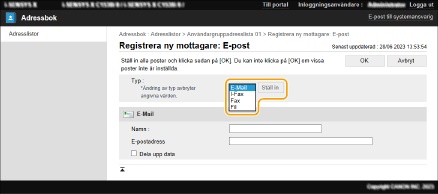 4 | Registrera nödvändiga uppgifter och klicka på [OK]. Vilka objekt som visas varierar beroende på typen av mottagare. För mer information om information att registrera, se Registrera mottagare i adressboken. |