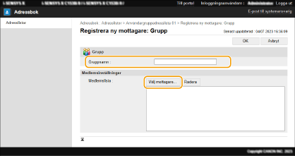 2 | Ange ett namn för gruppen i [Gruppnamn] och klicka på [Välj mottagare] för [Medlemslista]. ![]() |