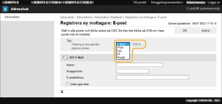 [Inställningar för Personlig adresslista/adresslista användargrupp], och markera kryssrutan [Använd Namnändring användargrupp till Användargruppsadresslistenamn.]. [Använd Namnändring användargrupp till Användargruppsadresslistenamn.] är bara tillgängligt när personlig autentisering är aktiverad.