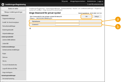 2 | Ange nyckelns namn och lösenord och klicka på [OK]. [Nyckelnamn]Använd alfanumeriska tecken för att ange det nyckelnamn som har registrerats på maskinen. [Lösenord]Använd alfanumeriska tecken att ange lösenordet för den privata nyckel som har ställts in för den fil du vill registrera. |
