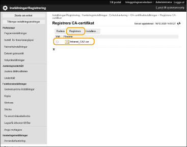 Välj det CA-certifikat du vill registrera och klicka på [Registrera].