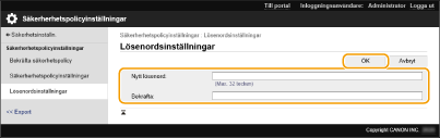 Ange det aktuella lösenordet i [Gammalt lösenord:], och klicka på [OK] utan att skriva något värde för [Nytt lösenord:] eller [Bekräfta:] (lämna dem tomma). Om en teckenbegränsning har angetts i [Policy för lösenordsinställningar], måste ett värde anges för den här inställningen. Avbryt begränsningen innan du tar bort lösenordet. Säkerhetspolicyinställningar