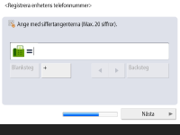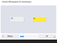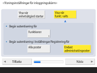 För att förbättra säkerheten för maskinen, använd maskinen under ett system som använder användarautentisering. ![]() Den här maskinen är inställd för att använda användarautentisering som inloggningstjänst. Mer information finns i Konfigurera inställningar för personlig autentiseringshantering. ![]() Tryck på <På> för <Använd användarautentisering>, tryck på <På> för den inloggningsmetod du vill använda och tryck sedan på <Nästa>. Om du inte använder användarautentisering, tryck på <Av> för <Använd användarautentisering>, tryck på <OK> och gå vidare till steg 5. ![]() Ange följande inställningar om det inte finns någon administratör förutom "Administrator" som registrerats i maskinen. ![]() Om du vill öka maskinens säkerhet genom att inaktivera "Administrator" och registrera en ny administratör, tryck på <Ja>. I Registrera administratör anger du <Användarnamn> och <Lösenord> och trycker på <OK>. Ange <E-postadress>, <Avdelnings-ID> och <Visa namn> efter behov. Mer information finns i Registrera användarinformation på den lokala enheten. "Administrator" inaktiveras nästa gång du loggar in. Om du vill arbeta som "Administrator", tryck på <Nej>. ![]() ![]() Välj tidpunkt för att visa inloggningsskärmen. Om du väljer <Visa när funkt. valts>, tryck på <Funktioner> för att välja funktionen som inloggningsskärmen ska visas för och tryck på <OK>. Välj också det inställningsalternativ på skärmen <Inställningar/Registrering> som inloggningsskärmen ska visas för. Om du väljer <Av> för <Tangentbordsautentisering>, tryck på <OK>. Fortsätt till steg 5. Om du väljer <På> för <Tangentbordsautentisering>, tryck på <Nästa>. ![]() ![]() Om du vill använda autentisering via inmatning med siffertangenter på inloggningsskärmen, tryck på <På> och sedan på <OK>. | |