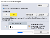 Ange maskinens datum- och tidsinställningar. ![]() ![]() Ange datum och tid och tryck sedan på <OK>. Ange <Tidszon> och <Sommartid> efter behov. Mer information finns i Ställa in datum/tid. | |