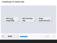 Ange metoden för att ansluta maskinen till ett nätverk. ![]() ![]() Du kan välja metod för att ansluta maskinen till datorer o.s.v. Välj den anslutningsmetod som ska användas och tryck på <Nästa>. Om du valde <Fast LAN> fortsätter du till steg 7. Mer information om metoder för nätverksanslutning finns i Välj metod för nätverksanslutning. ![]() Om du valde <Trådlöst LAN> anger du inställningarna för trådlöst nätverk. ![]() Mer information om trådlösa nätverksanslutningar finns i Ansluta till ett trådlöst nätverk. | |