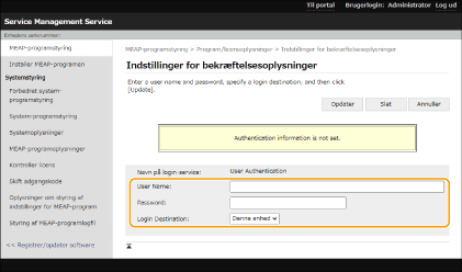 Hvis loginapplikationen ændres, skal du bekræfte godkendelsesoplysningerne igen i [Indstil MEAPgodkendelse]. Det kan være nødvendigt at indtaste godkendelsesoplysningerne igen. |