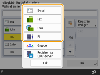 ![]() | Det er praktisk at registrere en ofte anvendt modtager i en hurtigkaldstast. På denne måde kan du hurtigt angive en modtager med et enkelt tryk på en knap. Foruden registrering af et faxnummer eller en e-mailadresse i en hurtigkaldstast kan du også registrere placeringen af en filservermappe (IP-adresse og sti) til brug ved lagring af scannede data. |