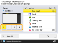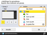 Du kan oprette en genvejsknap til funktioner på <Hjem>-skærmen. Brug denne knap til adgang til en anden funktion uden at gå tilbage til <Hjem>-skærmen. For at oprette en genvej skal du logge ind med administratorrettigheder.