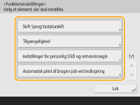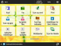 Du kan ændre de indstillingsknapper, der vises på skærmbillederne Grundlæggende funktioner (til kopiering, faxning og scanning). Du kan også vise et andet skærmbillede for grundlæggende funktioner, der er tilpasset hver enkelt bruger, der er logget på.