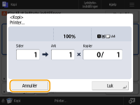Hvis du trykker på (Stop) på kontrolpanelet, når der venter kopijob, sættes alle kopijobbene på pause, og derefter vises meddelelsen <StopAngiv det kopijob, du vil annullere.> og listen over kopijobbene. Du kan vælge et kopijob på listen og annullere kopijobbet ved at trykke på <Annullér>. Hvis du vil genoptager kopieringen, skal du trykke på <Genopt. kop.>. |