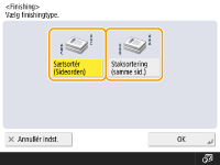 Afhængigt af papirtypen kan du ikke anvende finishing-funktioner. Hardwarespecifikationer Ved anbringelse af originalen på glaspladenHvis du trykker på <Tilvalg> <Jobopbygning> på skærmbilledet Grundlæggende kopifunktioner, kan du bruge funktionen Sætsortering/Staksortering, også selvom originalen er anbragt på glaspladen.Indsæt en jobseparator mellem hver side ved output med staksorteringHvis du vælger <Staksortering (samme sider)>, kan du indsætte en jobseparator mellem hver gruppe. For flere informationer kan du se <Jobseparator mellem grupper>. <Jobseparator mellem grupper> Når du konfigurerer indstillinger i <Se gemte filer>Du kan kun benytte finishing-funktioner ved print af PDF- eller XPS-filer. |