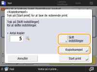 Tryk på <Skift indstillinger> for at ændre indstillingerne. <Kopieksempel> vises, når indstillingerne er ændret. Kopiér et eksempel igen.