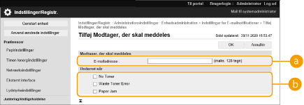 Resultatet af afsendelse af mailen kan ses i [Status Monitor/Annullér] i [Joblog]. Denne indstilling kan kun angives af en bruger med administratorrettigheder. Denne indstilling kan kun importeres fra/eksporteres til maskiner i den samme serie. Import/eksport af indstillingsdataene Denne indstilling findes i [Grundlæggende oplysninger om indstillinger/registrering] ved batcheksport. Import/eksport af alle indstillinger |