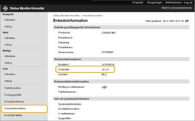 ![]() | Ny firmware frigives fra tid til anden for at tilføje nye funktioner eller løse problemer med eksisterende funktioner. Hvis en ny firmware er tilgængelig, skal du følge proceduren herunder for at opdatere den på maskinen. Administratorrettigheder er nødvendige for at opdatere firmwaren. |