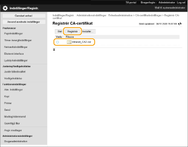 Vælg det CA-certifikat, du vil registrere, og klik på [Registrér].