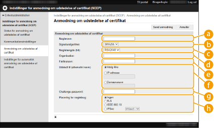 En anmodning om udstedelse af det certifikat, der kræves til nøgler, der er genereret med maskinen, kan sendes til en SCEP-server (Simple Certificate Enrollment Protocol), der administrerer certifikater. Certifikater, der er udstedt fra SCEP-serveren registreres automatisk til maskine. Der kræves Administrator-rettigheder for at sende en anmodning om udstedelse af et certifikat.