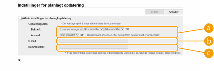 Hvis download af firmware ikke er udført, eller den downloadede firmware ikke er blevet anvendt, kan du ikke udføre en planlagt opdatering.