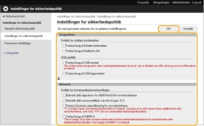 Maskinindstillinger, der er relateret til informationssikkerhed, kan batchanvendes og -administreres. Det anbefales, at den administrator for informationssikkerhed, der står for administrationen af din sikkerhedspolitik, anvender sikkerhedspolitikken på maskinen i overensstemmelse med politikken i din organisation. For at konfigurere sikkerhedspolitikken skal du logge på Remote UI (Brugerinterface til fjernbetjening) med administratorrettigheder.